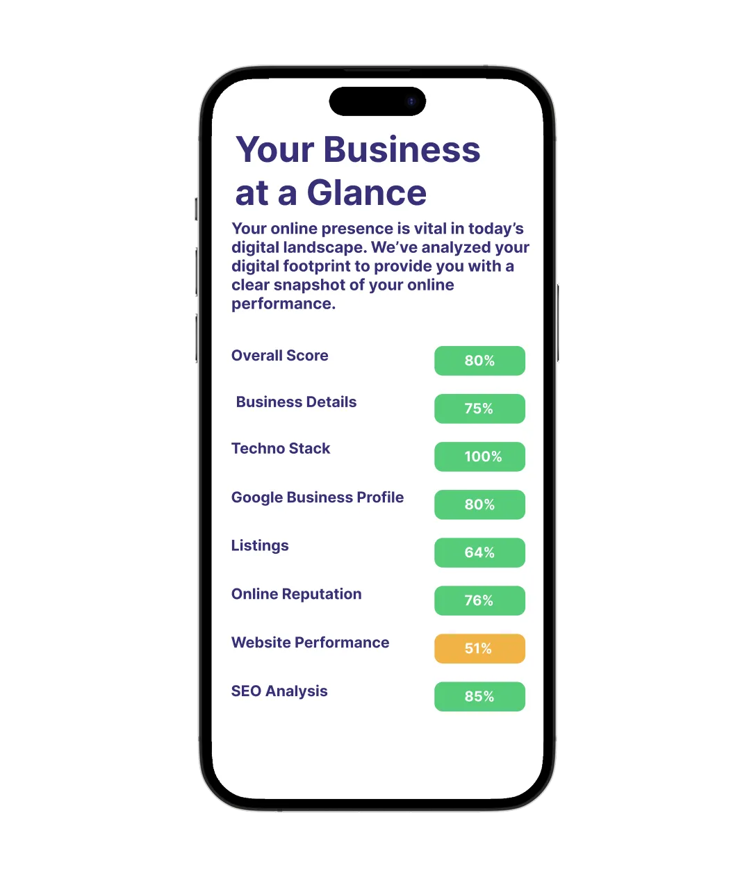 Simply fill out the form with your business name during checkout. Our system analyzes your online presence and delivers a clear, easy-to-read PDF report straight to your inbox.